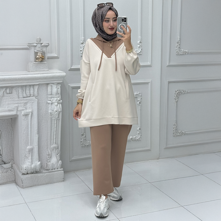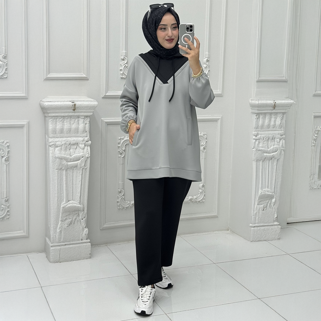 ✦ Tunique longue à col V inversé avec empiècement contrasté✦ Pantalon droit taille élastique assorti